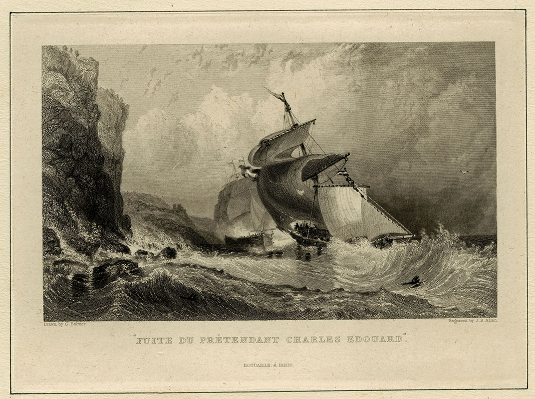 departure from Scotland for France, (Fuite du Pretendant Charles Edouard), 20 September 1746; (a) G Balmer; (e) J B Allen; (p) Houdaille; 8.2 x 13.4 cms.