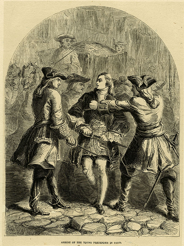 being arrested in Paris, for refusing to leave France as required by the treaty of Aix-la-Chapelle, 11 December 1747; (a,e) T H Nicholson; (p) Cassell's Illustrated History of England Vol IV [p 535], Cassell Petter & Galpin; [1865-74]; 19.9 x 15 cms.