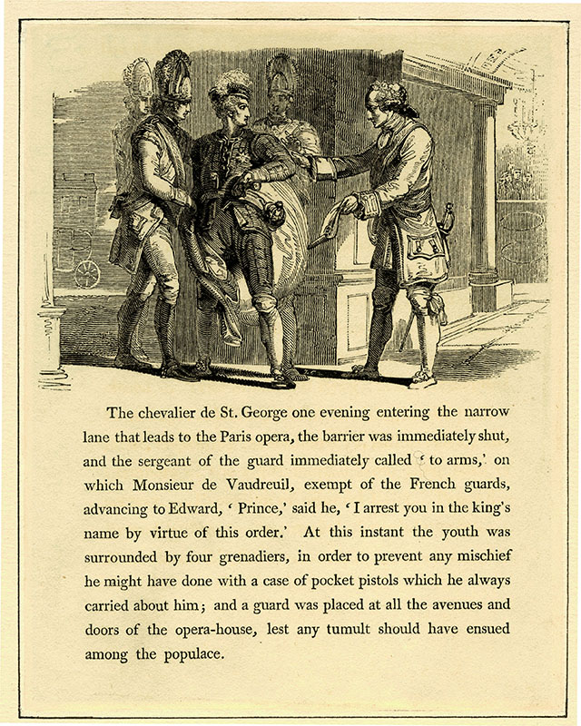 being arrested in Paris, for refusing to leave France as required by the treaty of Aix-la-Chapelle, 11 December 1747; with text in which the mistake is made in styling him The Chevalier de St. George; 7.2 x 10.5 cms.