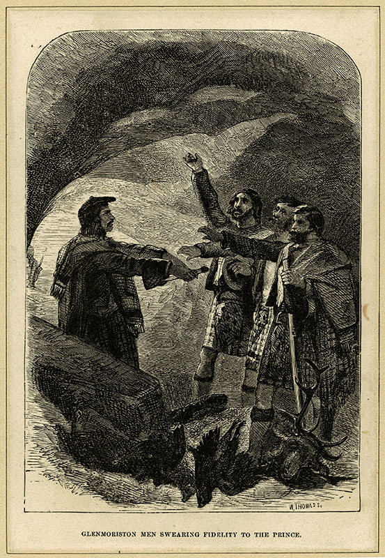 the 'Seven Men of Glenmoriston' swearing their fidelity to the Prince after Culloden, 1746; (e) W Thomas; 12.6 x 8.8 cms.