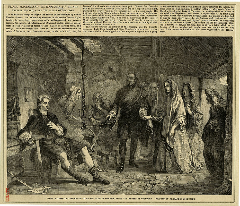 introduced to Flora Macdonald after the Battle of Culloden, June 1746; (a) A Johnstone; (p) London Illustrated News [p 292], 2 October 1852; 16.4 x 23.4 cms.
