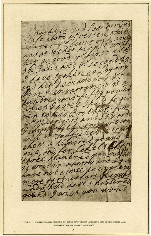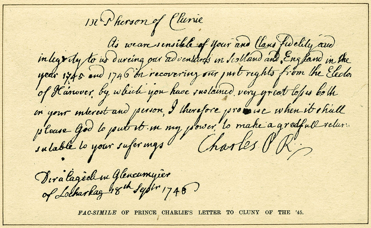 facsimile of Charles Edward's letter to Ewen MacPherson of Cluny [Cluny of the '45] (1700 ?-1756), in recognition of his services in the 1745-6 campaign, 18 September 1748; 8.9 x 13.5 cms.
