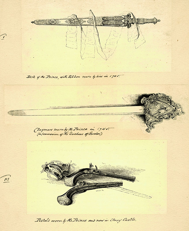 relics; weaponry worn by him during the campaign 1745-6; (i) dirk with ribbon; (a) W Dickes; (e) J Kirchner; (ii) claymore; (a) W Dickes; (e) J Keck; (iii) pistols; (e) J Keck; 20 x 18 cms.