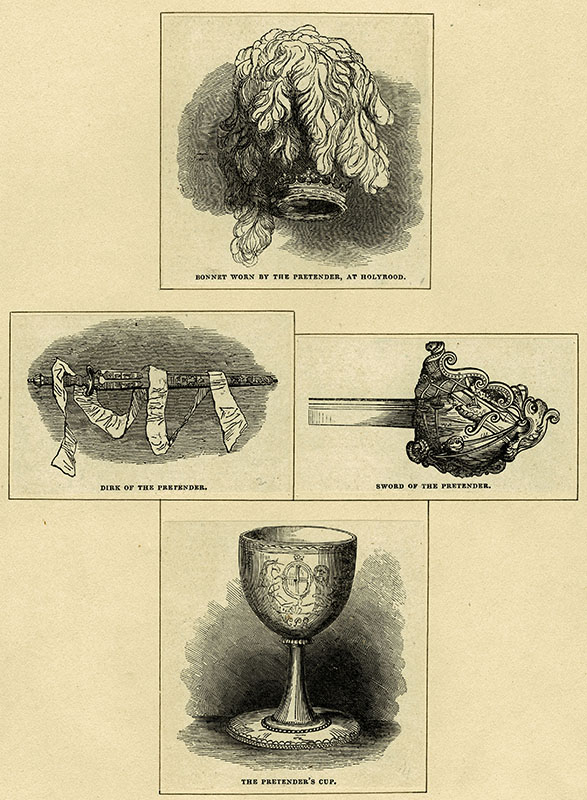 relics; bonnet, worn at the Ball at Holyrood, 1745, dirk, sword and silver drinking cup; 22.5 x 16.5 cms.