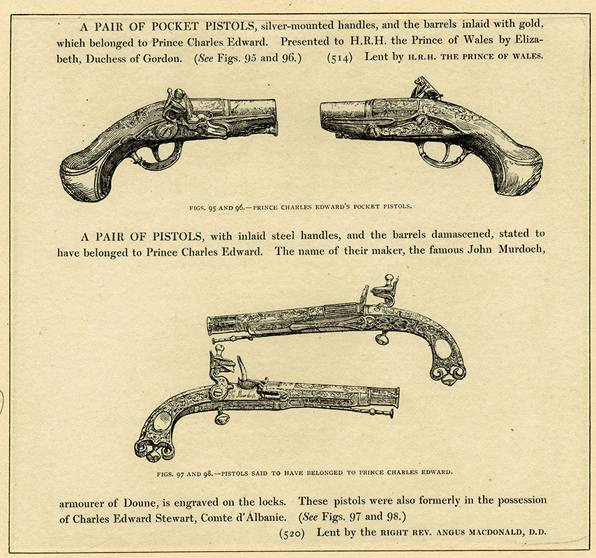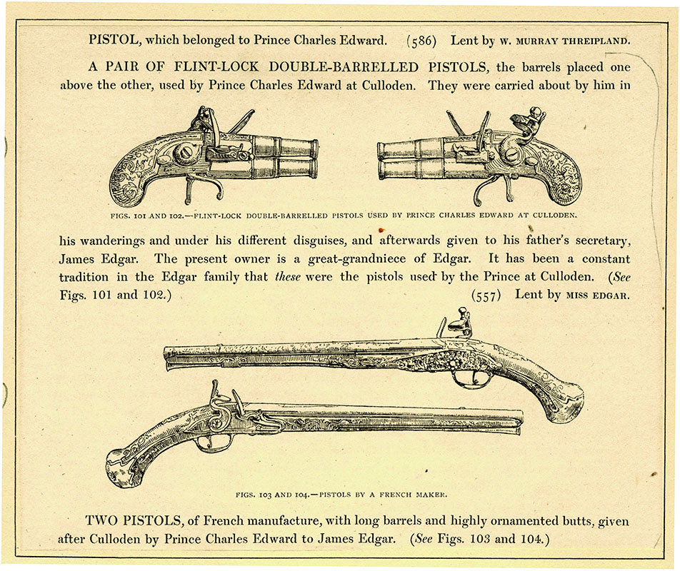 relics given by Charles Edward to his father's secretary, James Edgar; (i) flint-lock double-barrelled pistols used by Charles Edward at Culloden, 16 April 1746; (ii) pistols of French manufacture; 12 x 14.5 cms.