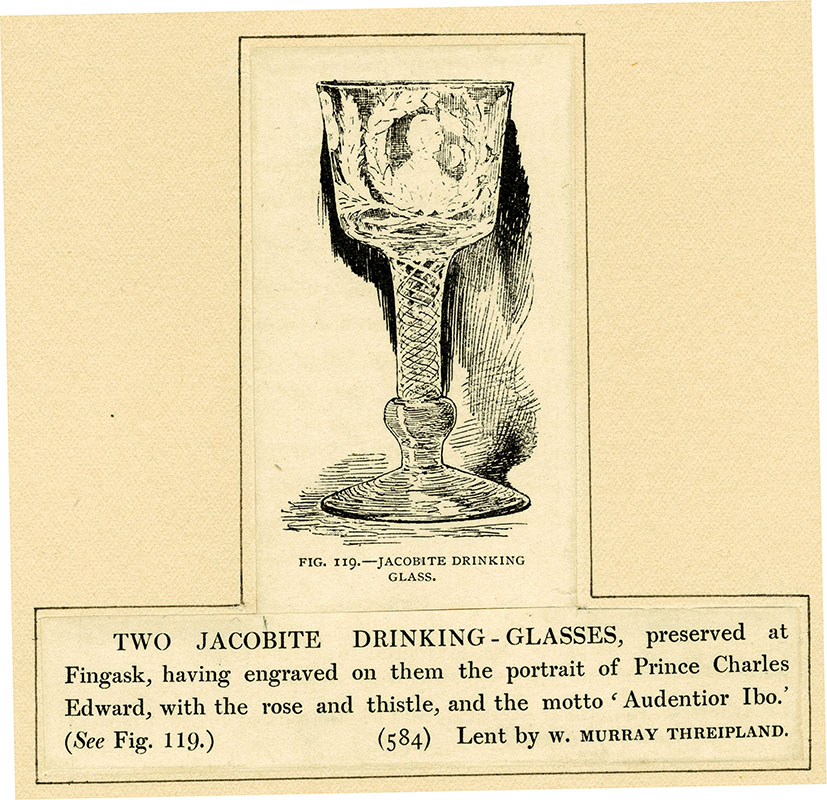 relics; Jacobite drinking glass with engraved portrait of Charles Edward, the rose and thistle, and the motto 'Audentior Ibo'; 7 x 4 cms.
