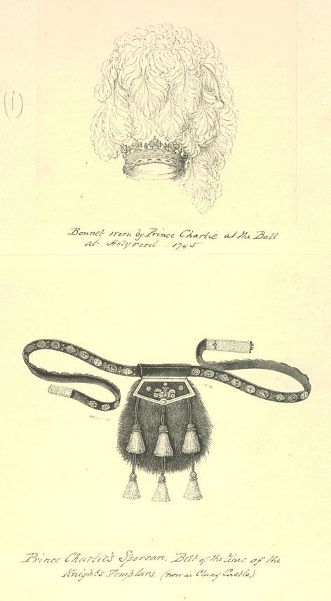 relics; (i) bonnet worn at the Ball at Holyrood, 1745; (a) W Dickes; (ii) sporran with belt of the time of the Knights Templars; (a) W Dickes; (e) J Keck; 20 x 10.5 cms.