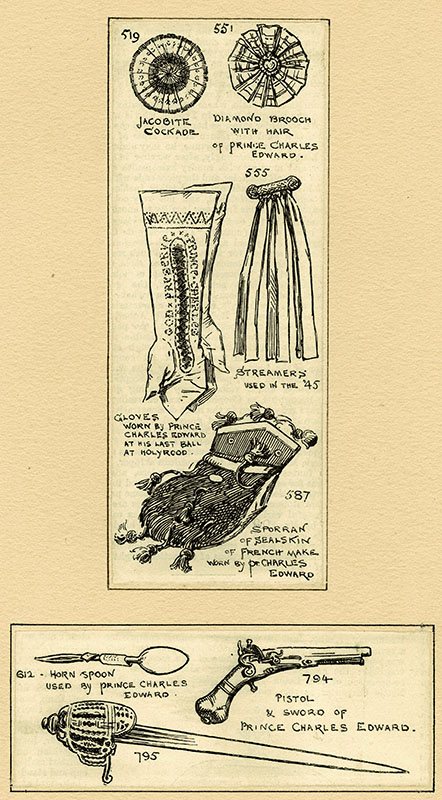 relics; Jacobite cockade, diamond brooch with hair of Charles Edward, gloves worn at last Ball at Holyrood, streamers, sporran, horn spoon, pistol and sword; 20 x 11 cms.