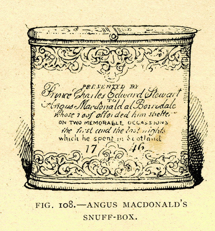 relics; silver snuff-box, given by Charles Edward to Angus Macdonald (Borrodale), in whose house he spent his first and last nights in mainland Scotland, with text; 10.5 x 14.5 cms.