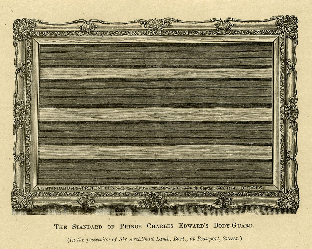 relics; the Standard of his body-guard, the Life Guards, taken at the Battle of Culloden by Captain George Burges; 8 x 11.2 cms.