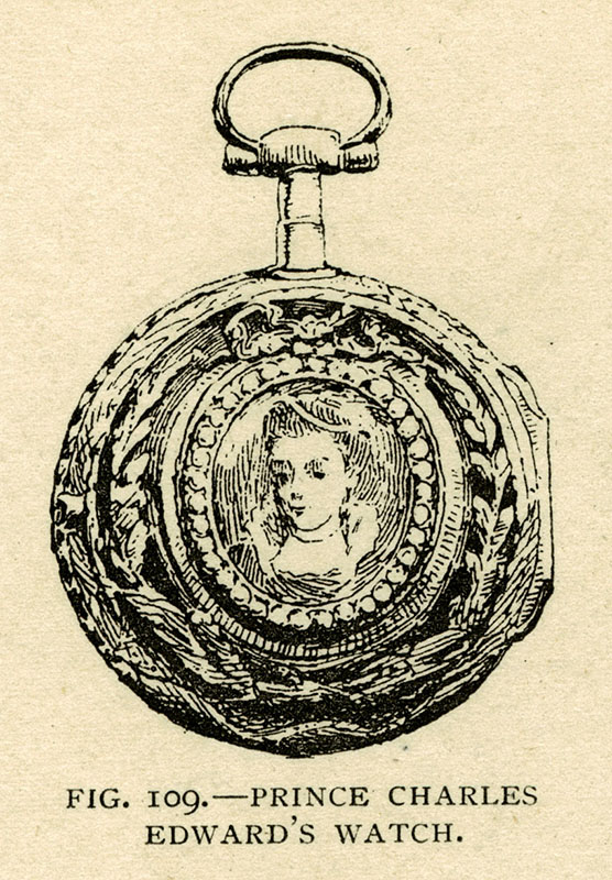 relics; gold watch on the back of which is a portrait in enamel of the Duchess of Albany, his daughter by his mistress, Clementina Walkinshaw; 6.5 x 14.5 cms.