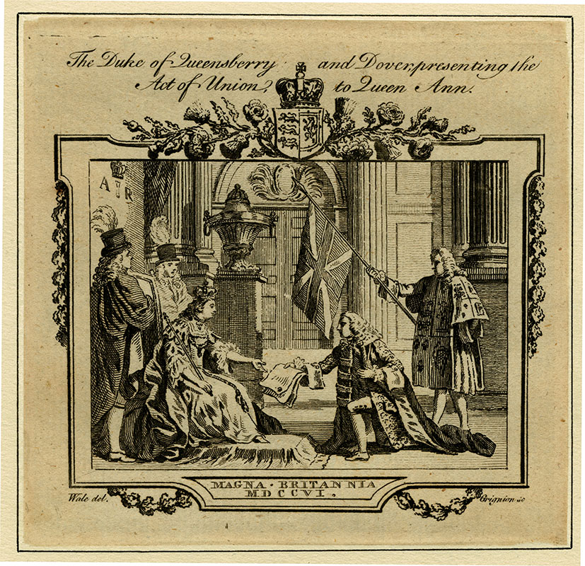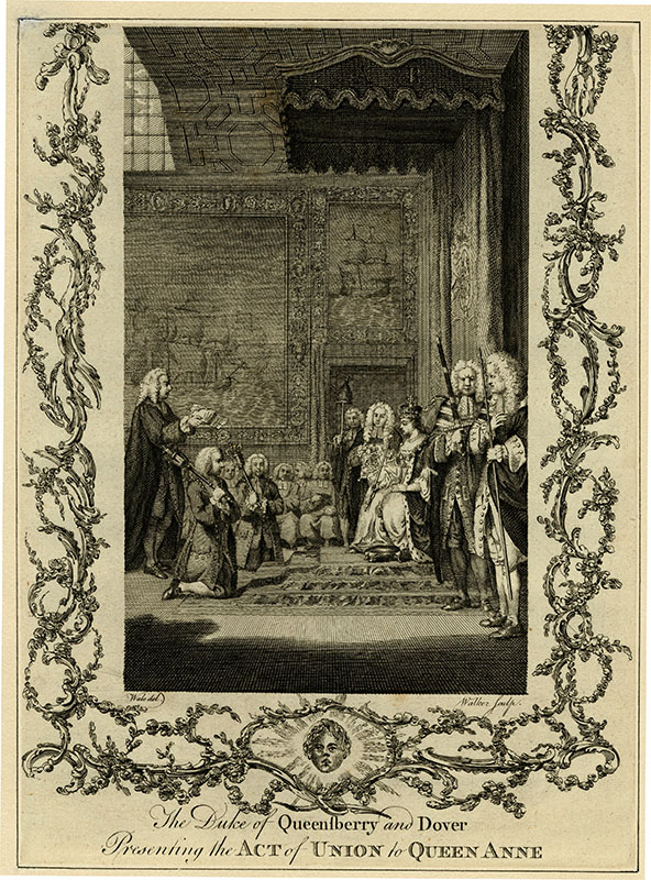 lord privy seal, commissioner for England and lord commissioner for the Queen; presenting the Act of Union to Queen Anne, 1706; (a) S Wale; (e) W Walker; 21 x 15.5 cms.
