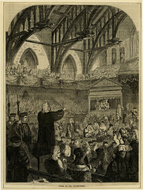 political preacher, impeached for sedition, 1710; DNB; addressing the court whilst on trial for preaching sermons favouring non-resistance, and condemning toleration and occasional conformity, Westminster Hall, 27 February 1710; (p) Cassell's Illustrated History of England Vol IV [p 265], Cassell, Petter & Galpin; [1865-74]; 21 x 15.6 cms.