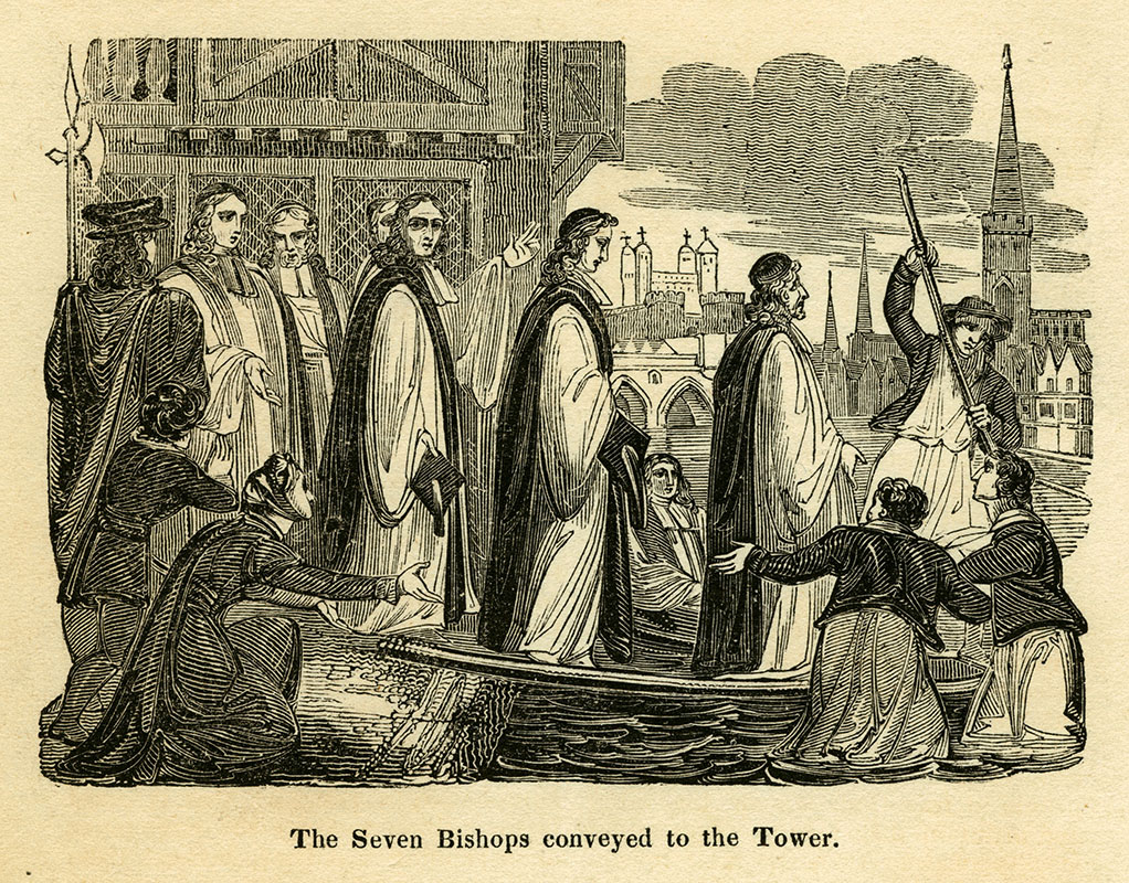after James ordered the second Declaration of Indulgence to be read in all churches, May 1688, the Seven Bishops who petitioned against it were committed to the Tower, 8 June 1688, prior to being tried for seditious libel; 8 x 10.7 cms.