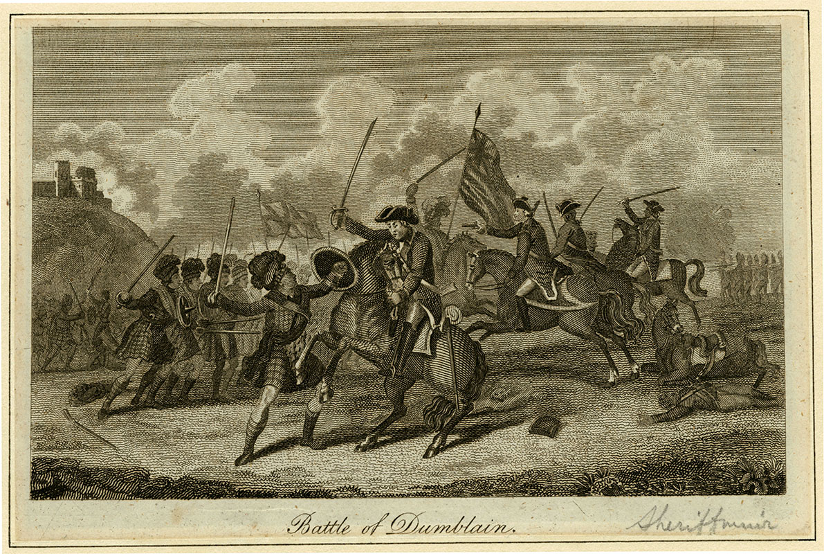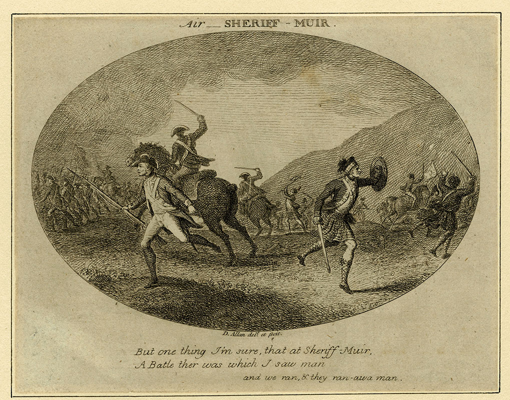 in which the Jacobites, under John, 6th Earl of Mar, fought the pro-Hanoverian force under John, 2nd Duke of Argyll; scene of the Battle with accompanying extract from the Sheriffmuir Air (Anon); (a,e) D Allan; 10.6 x 13.5 cms.
