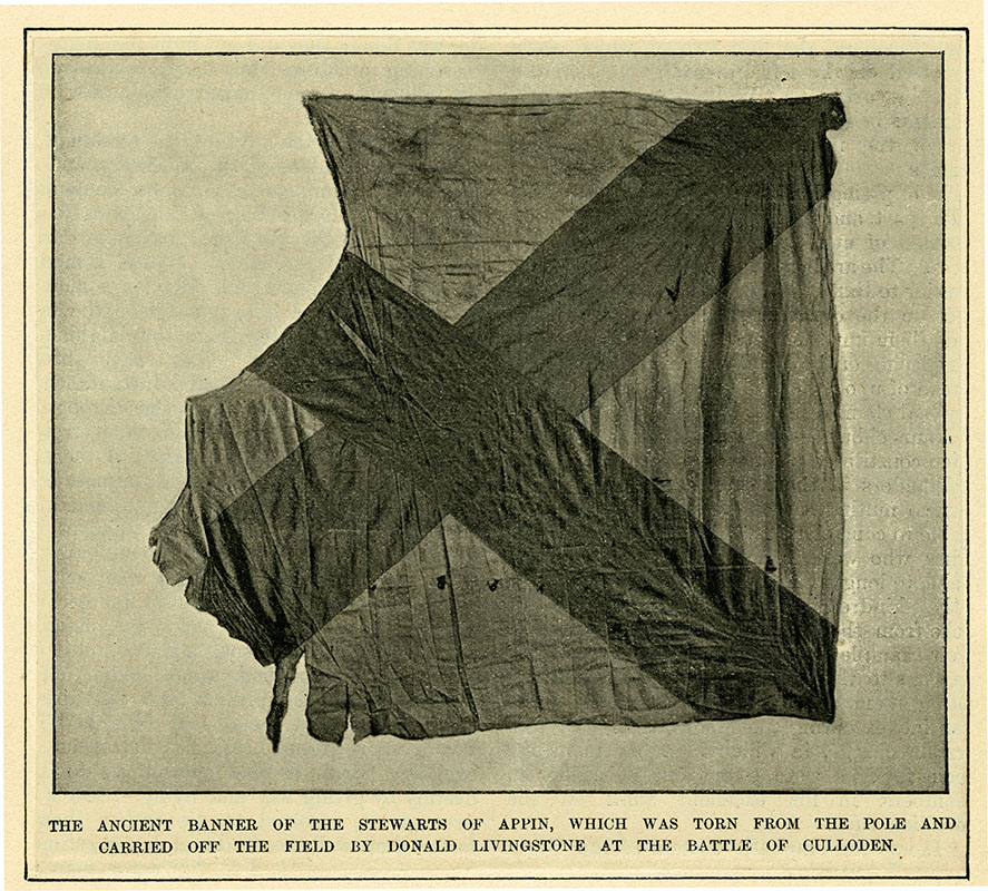 Jacobites, whose contingent of some 300 clansmen at the Battle of Culloden, 16 April 1746, suffered casualties of 93 killed and 67 wounded; their Ancient Banner was torn from the pole and carried of the field by Donald Livingstone; 10.5 x 12.7 cms.