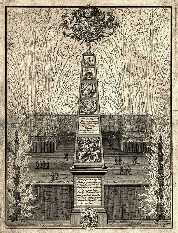 display of fireworks at the Scots' College in honour of the birth of the Prince of Wales, Paris, 8th July 1688; (p) L Innes; 22.5 x 16.7 cms.