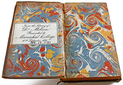 The books belonged to the private library of Dr James Melvin, (1795-1853) (MA Marischal College, 1813; LLD, 1834), Rector of Aberdeen Grammar School (1826-53) and were presented to Marischal College, his alma mater in 1856, by his sister Miss Agnes Melvin. The Collection was further added to by Francis Edmond, LLD, of Kingswells in 1884.