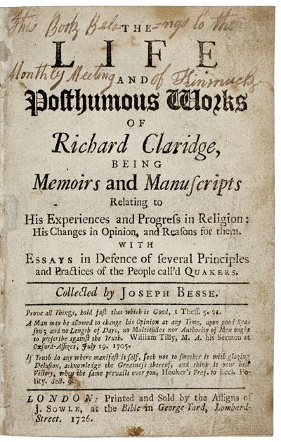 A core element of the Collection relates to the writings of Quaker apologists and biographers, but there are more general religious books. They date mainly from the seventeenth and eighteenth centuries, though some are from the nineteenth century.