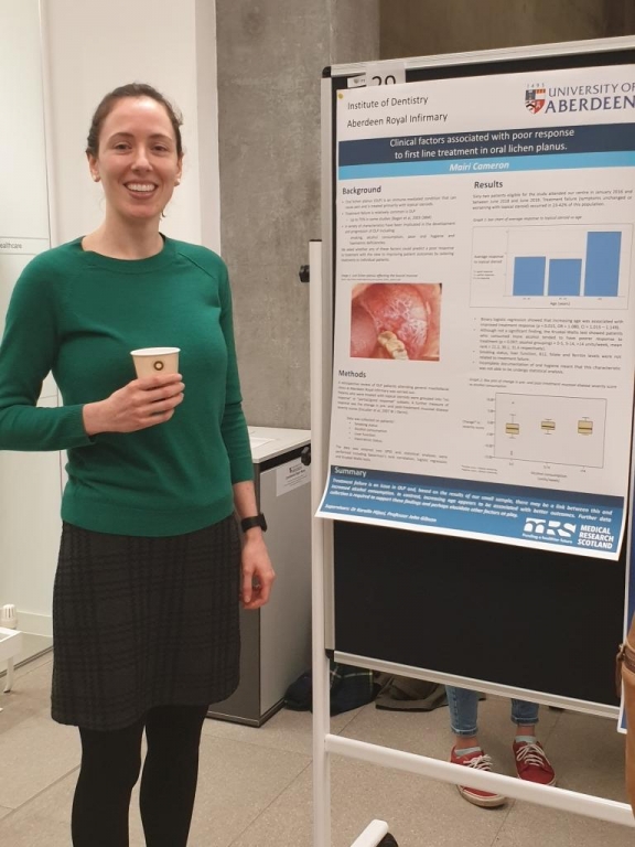 Big congratulations go to BDS4 student Mairi Cameron who recently attended the British and Irish Society for Oral Medicine’s Winter meeting in Birmingham. Mairi presented her summer project work on “Clinical factors associated with poor response to first line treatment in oral lichen planus” which had been supervised during the summer by the Institute of Dentistry’s Dr Karolin Hijazi. We are delighted to report that the presentation was very well received in Birmingham, winning Best Undergraduate Oral Presentation. This is fantastic news and we offer our warmest congratulations to Mairi.