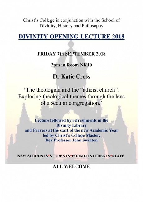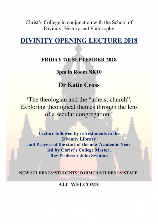 This will take place on Friday 7th September 2018 in New Kings 10 at 3pm and will be followed by refreshments in the Divinity Library and prayers for the start of term led by Christ’s College Master, Rev Prof John Swinton.