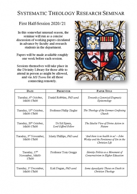 Sessions themselves will take place in the Divinity Library for those able to attend in person as might be allowed, and via MS Teams for all those connecting remotely.