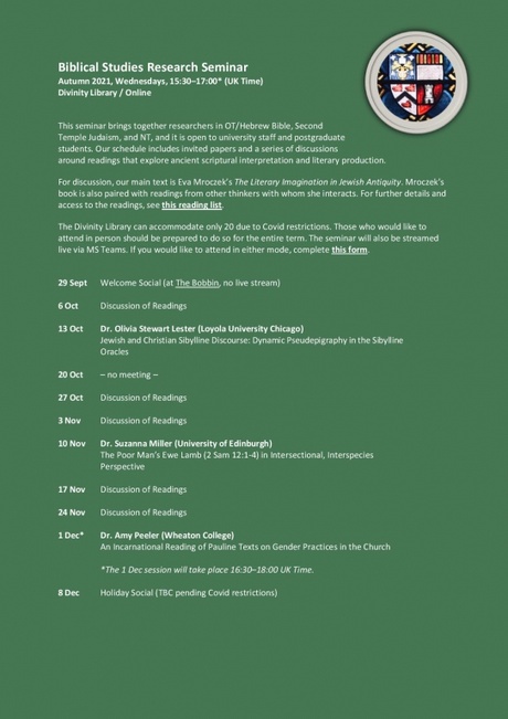 The autumn 2021 Biblical Studies Research Seminar series will meet on Wednesdays, 15:30–17:00. Please see the attached schedule for all details.