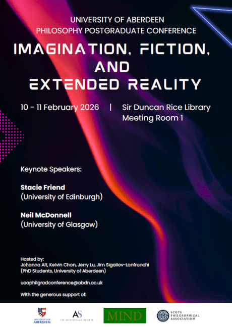 The inaugural University of Aberdeen Philosophy Postgraduate Conference will take place at the University of Aberdeen, Sir Duncan Library, Meeting Room 1, from February 10-11, 2026. The theme of the conference is imagination, fiction, and extended reality.