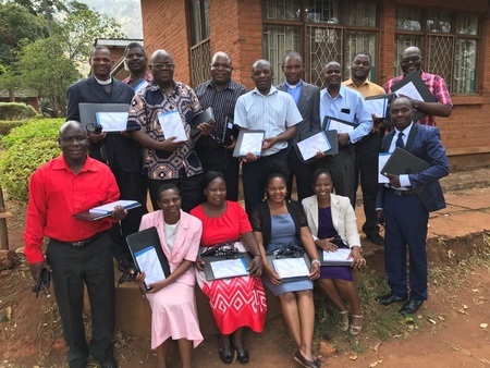 Rev Dr Ken Jeffrey returned to Malawi at the start of October to welcome a new class of fifteen students who have started the MTh Ministry Studies programme which is hosted at Zomba Theological College. They took the first of their four courses, Spiritual Formation, and spent time considering the contributions of the Desert Fathers and Mothers, Benedict, Julian of Norwich, Thomas a Kempis, Ignatius of Loyola, John Calvin, Dietrich Bonhoeffer, Henri Nouwen and Richard Rohr to the tradition of Christian spirituality. The students also received laptops which were recycled by the IT Services team at the University. The photograph shows Dr Jeffrey and the new class of students in Zomba.