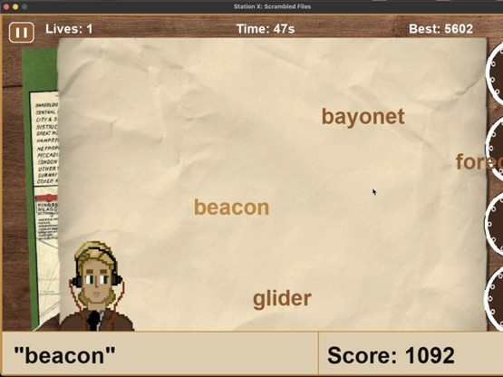 Station X: Scrambled Files is our WWII inspired typing racer game where you step into the role of a codebreaker under pressure. Words rush across the screen and you must type them before time runs out, with limited lives and increasing speed. It’s fast, tense, and dynamic in the best way. We also included a searchable logbook of real historical terms, so you’re learning while you play. The result is challenging, thrilling, and addictive.