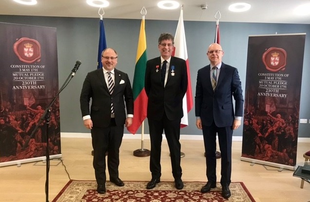In a unique ceremony held at the Embassy of the Lithuanian Republic in London on 5 May 2021, Robert Frost was awarded orders by the ambassadors of Lithuania and Poland. In the presence of the ambassadors of Ukraine, Hungary, Latvia and Slovakia, he received the Knight's Cross of the Order of Merits for Lithuania from ambassador Renatas Norkus, and the Knights Cross of the Order of Merit of Poland from ambassador Arkady Rzegocki. In their speeches, both ambassadors stressed the significance of the establishment of the Centre for Polish-Lithuanian Studies at the University of Aberdeen in January 2020.
