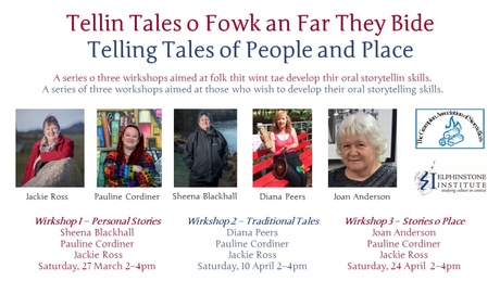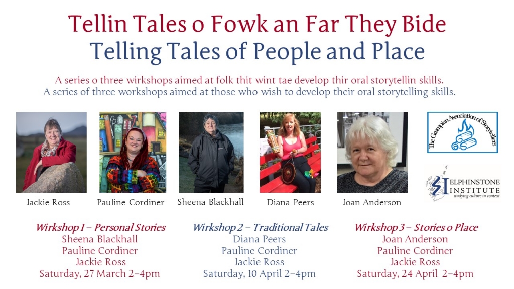 The Elphinstone Institute is pleased to be collaborating with our friends at the Grampian Association of Storytellers to bring you a series of storytelling workshops on the theme of 'Tellin Tales o Fowk an Far They Bide’. The workshops will be led by talented storytellers Jackie Ross, Pauline Cordiner, Sheena Blackhall, Diana Peers, and Joan Anderson.
