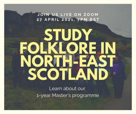 Join Institute staff and students on Zoom to learn about our 1-year Master's programme at the University of Aberdeen in Ethnology and Folklore. There will be opportunities to hear about the programme, ask questions, and enjoy short pre-recorded performances by local performers. For further information on our programmes of study see Programmes of Study | Elphinstone Institute | The University of Aberdeen (abdn.ac.uk)