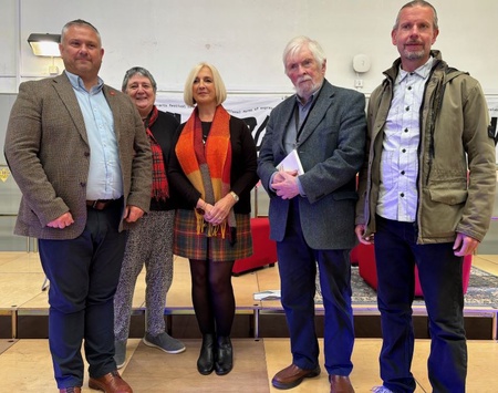 Deborah Leslie won the prize this year. Deborah is pictured centre along with Steven Reid (co-sponsor), Sheena Blackhall, Richard Bennett (Lead Judge) and Martin Reid (co-sponsor), Martin and Steven are grandsons of John Reid (aka David Toulmin).