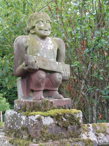 Stone carving, used as a gate post decoration, of a caricatured human figure. The late Captain Hay of Delgatie was an inveterate collector and the castle has many decorative elements that are now difficult to attribute to exact dates and provenances.