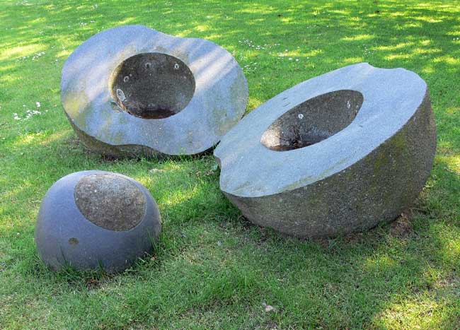Carved from Indian Black Granite, a partial sphere with two larger hemispherical shapes suggestive of a sliced fruit, a peach for instance, each has a hemispherical void in its centre that matches the smaller sphere which is itself suggestive of the fruit stone. Contrast is provided by polished and unpolished surfaces.