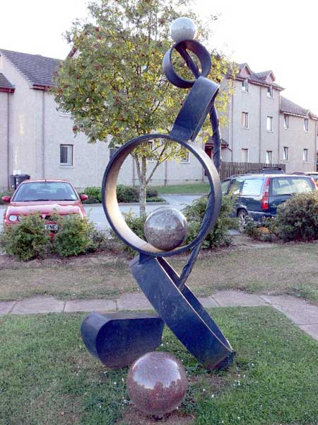 Metal and Granite, modernist sculpture with an iconography related to the game of golf. The sculpture is a reminder that the surrounding housing development is built on land that formed part of Inverurie old Golf Course.