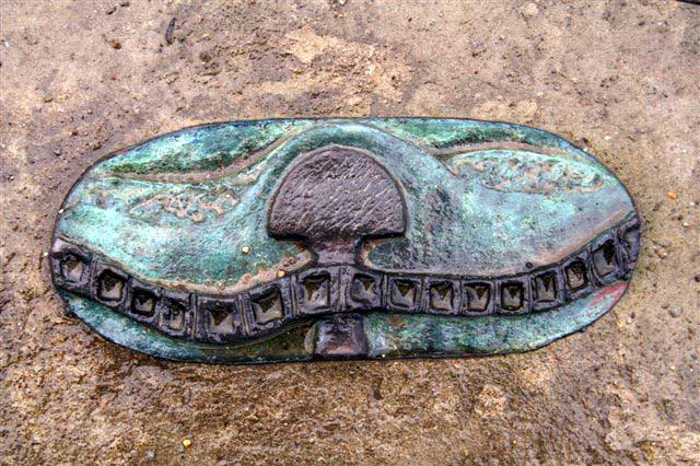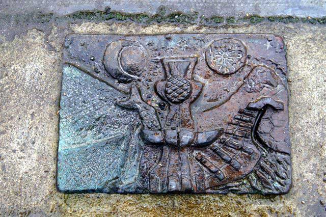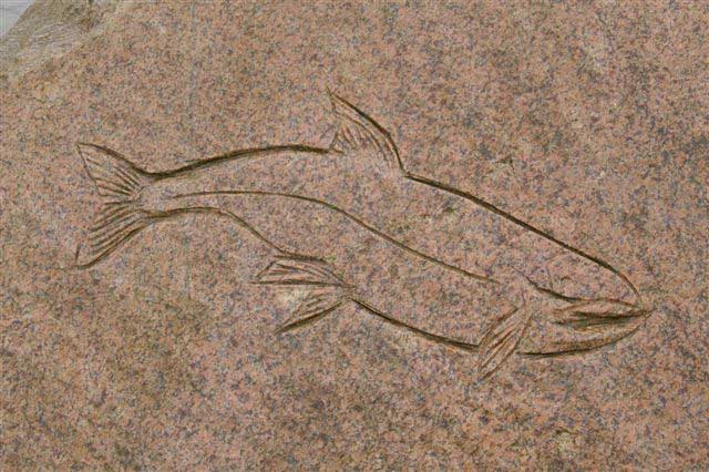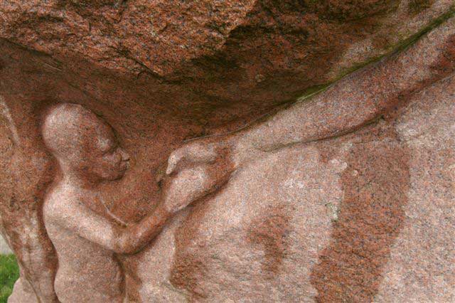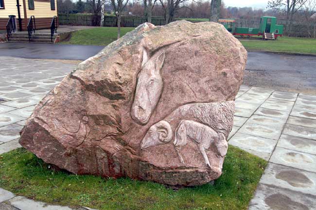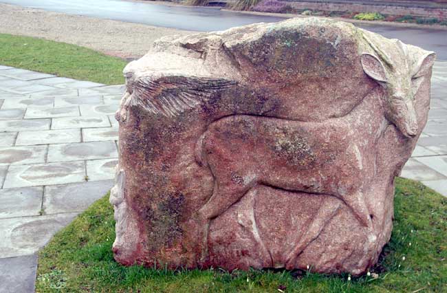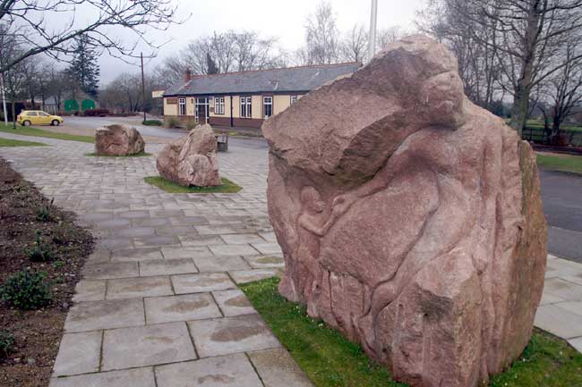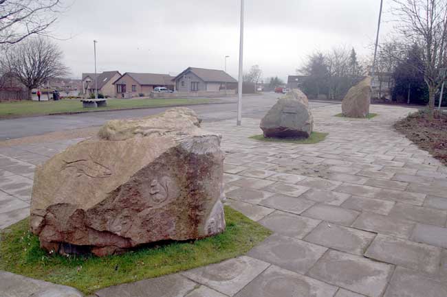 Installation of 3 relief carved pink granite boulders by Louise Gardner, showing people and animals, with small ceramic tiles by local schoolchildren set into the pavement.