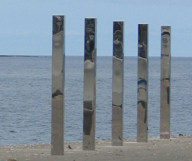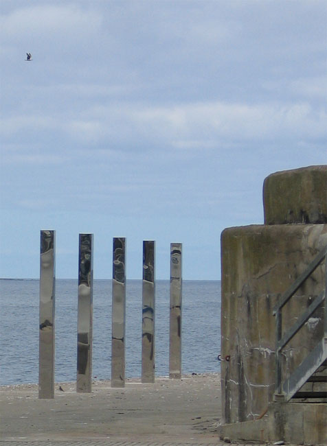 As part of the first Coast Festival (23rd-26th May2008 ). One of three commissioned temporary public art works. It consisted of 5 uprights in polished steel. These created a complex visual environment of reflections, shadows and reflected light beams. Constantly changing in accordance with the light and the viewers position.