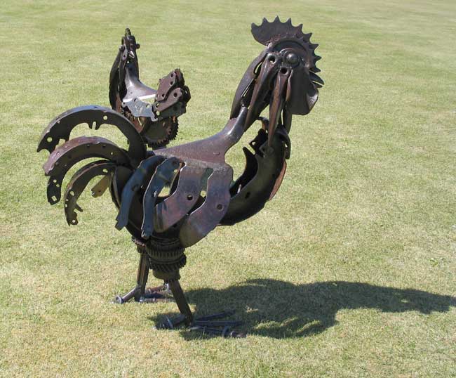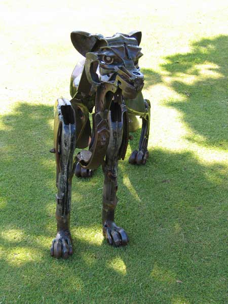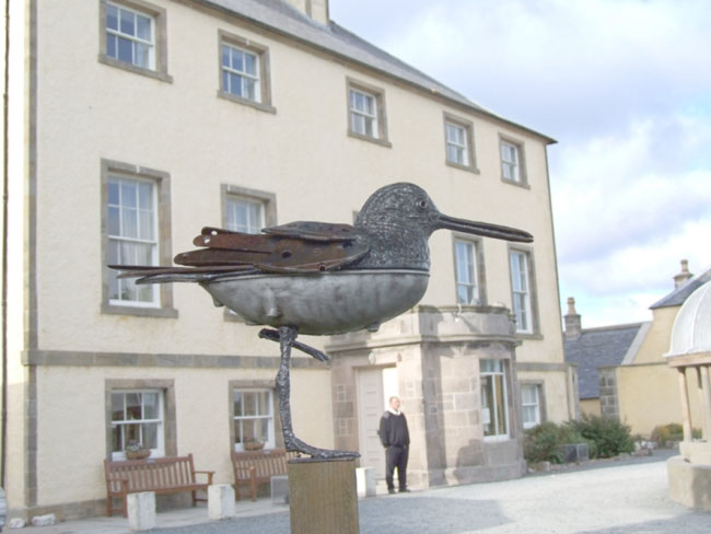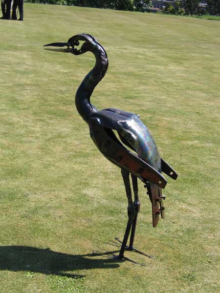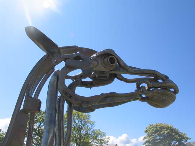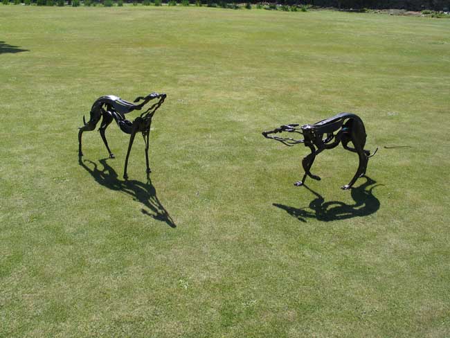 While many artists world wide produce sculptures of animals using the technique of welded assemblage Helen's pieces are outstanding in her apprehension of both the basic anatomy and the movement and expression of each species. She is also careful not to completely lose the original identity of the materials used in the works construction. The nature of the scrap used often add considerably to the numinous qualities of the finished piece. In my personal view the best of her works are those pieces that evoke rural Scotland (deer, sheep, horses, hunting dogs, native birds etc.) given extra poignancy by being made of the detritus of the rural economy of the recent past.