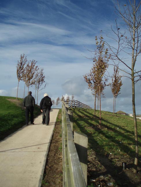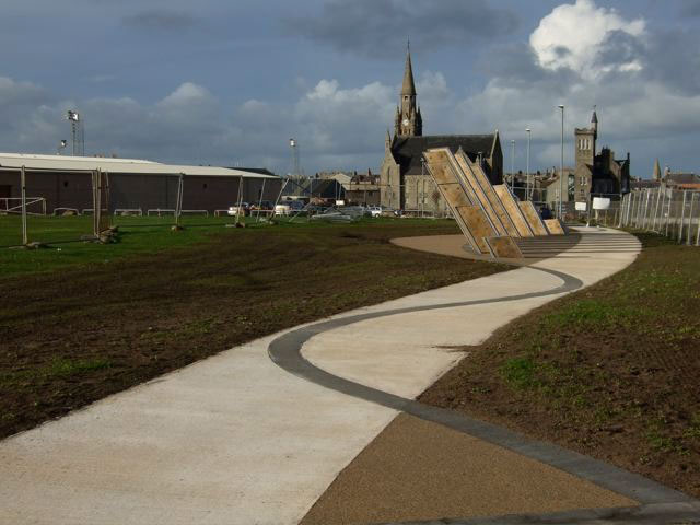 The 'Walking Way' is the creation of Scottish artist Jane Kelly. The winding pedestrian pathway of cast white concrete was laid late summer 2007. It covers an area from the grassy Links beside the town’s Leisure Centre car park, to the crossing at South Harbour Road. The shape has been influenced by the town’s former rail routes.