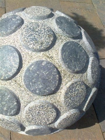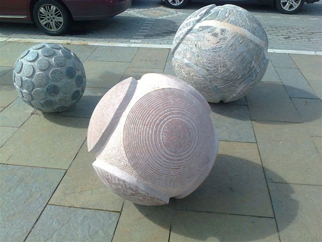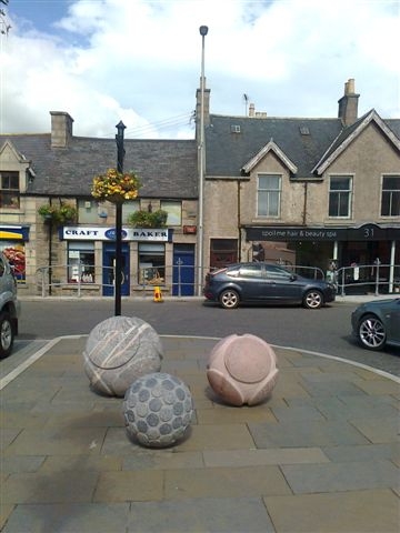 A sculpture consisting of three large spheres of granite, gneiss and gabbro; sourced from Aberdeenshire quarries. Carved in designs based on the enigmatic neolithic stone balls known as 'petrospheres' that are estimated to have been produced between 5,000 and 2,000 B. C. These neolithic objects, of hand holding size, and of unknown function are peculiar to Scotland (except for 1 Irish and 4 Northern English finds) and have been found in considerable number particularly in the North-east, currently 425 known . They are decorated with varied numbers of knobs or more precisely convex discs anything from 3 to 160. Perhaps the best known because one of the most highly decorated is the Towie Ball. See external link to NMS