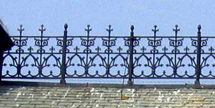 19th century gothic revival decorative ironwork based on a trefoil motive, installed along the roof ridge. The more recent seagull defences of chicken wire somewhat spoil the overall effect.