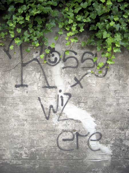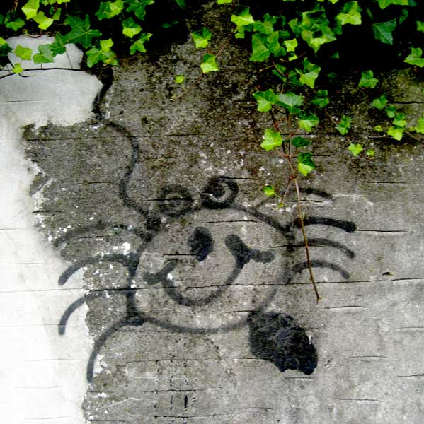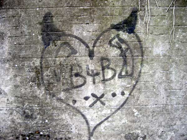 A fairly typical example of monochrome tag, text and cartoon based graffiti by an unambitious spry painter.