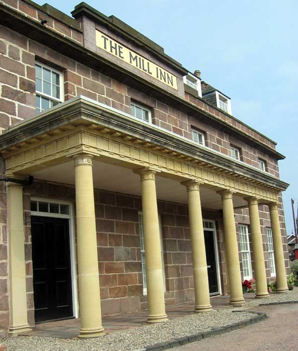 S (PRINCIPAL) ELEVATION: ground floor with colonnade, outer pilasters and Doric entablature with triglyphs, metopes and guttae, mutuled cornice and blocking course across 3 centre bays with window flanked by panelled timber doors with 4-pane fanlights, windows to remaining bays, and smaller regular fenestration close to eaves at 1st floor. Blocking course with raised centre comprising corniced ashlar tablet and painted panel reading 'THE MILL INN'. 2 slate-hung piended dormer windows to each side behind blocking course.