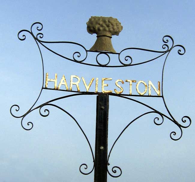 A farm sign in painted wrought and sheet steel. With the name Harvieston in cut steel letters, the whole surmounted by a repoussé corn sheaf. The iconography suggests that the farm name is being interpreted as 'harvest town' understandable if linguistically unlikely. In the north east of Scotland the word town or toon is still commonly used in its older sense of a farm steading as well as in the modern sense of a conurbation.