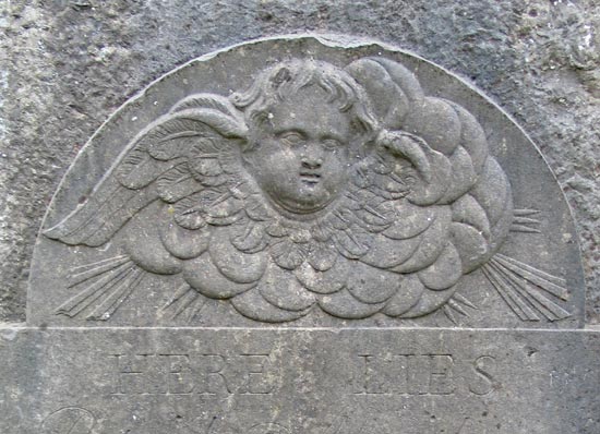 A fine example of an 18th century tombstone. Decorated with a cherubic angel's head in front of clouds from behind which emanate solar rays. The beautifully executed inscription commemorates Patrick Maitland late in little Ardoch, Jean Robertson his spouse several of their children and Charles Maitland