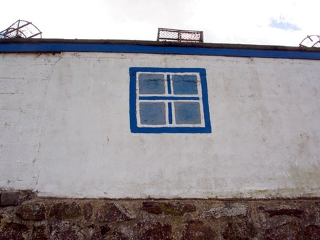A blank white shed wall is relieved by a painted window frame that somehow evokes the view that it would have if it were real.
