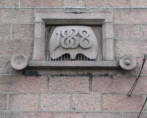 One of several ornate carved 19th century datestones on buildings in the town centre. The pink Peterhead granite is the towns signature material. The metal spikes are an attempt to limit nesting places for the Herring Gulls that throng this fishing port in huge numbers.