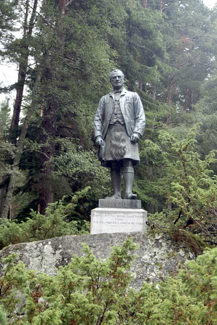 Bronze statue of John Brown, Queen Victoria's gillie, in Highland dress, inscribed with his name on a granite plinth. The inscription on the plinth reads: